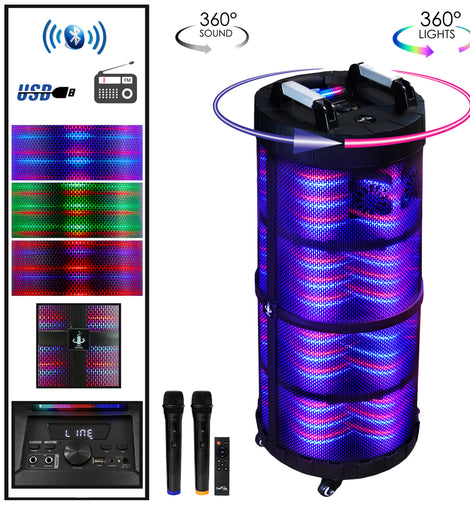 Enjoy endless music via Bluetooth, FM Radio, USB Flash Drive and AUX-In Port while the 360 Degree LED lights and light strip dace the night away. Take the fun with you, as the speaker is easily portable with four wheels and two handles, for easy mobility.