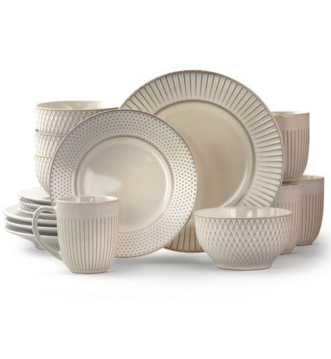 Add a beautiful accent to your dining table with the Elama Market Finds 16 Piece Round Stoneware Dinnerware Set in Embossed White. Each dish is creatively crafted into unique and contemporary shapes and beautifully colored in elegant white with embossed accents. Beautiful and elegant tableware is ideal for special occasions and durable for everyday use. Each plate is microwave safe for quick reheating and dishwasher safe for easy cleaning.