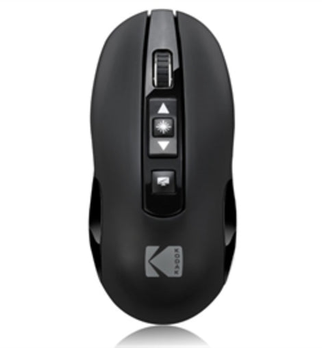 The Kodak IMOUSE Q80 is a multifunctional wireless mouse presenter. It can operate both as a regular desktop mouse or as a wireless presenter depending on different usage applications. This dual mode design feature provides versatility and convenience by eliminating the need of having both a presenter and a mouse. The built-in motion sensor allows waving the mouse in air and the mouse pointer will move according to the waving motion, enabling you to have computer control from anywhere in the room. It's power laser pointer is bright and easy to see, providing more engagement between you and the audience. Last but not least, its compatibility with multiple different popular software for presentation makes it a great presenting peripheral companion.