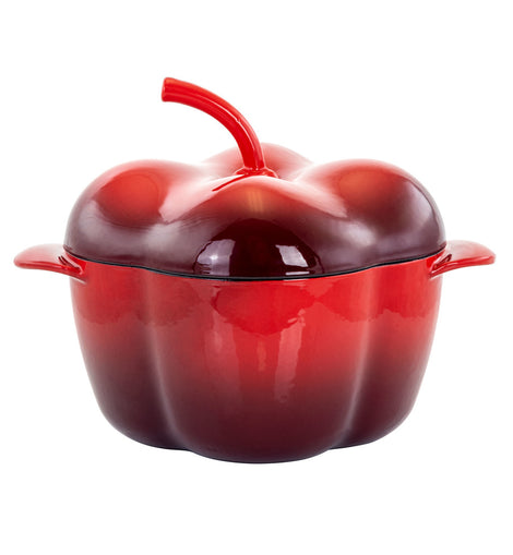 Cook in style with the MegaChef Pepper Shaped Enameled Cast Iron Casserole in Red. It features a unique bell pepper shaped base that makes for a stunning presentation when serving guest. The form brings visual flavor to the everyday home kitchen. The non-stick enamel coating makes it easier to cutback on fats and oils for healthier dishes. With a cast iron lid, any meal can cook evenly through the entire pot. Cook to your heart's content no matter how strong or acidic the ingredients are. This pot's outer coating protects the cast iron interior from corrosive material while providing all the advantages to cast iron cooking. Concoct savory stews, mesmerizing mac n cheese or ridiculously good risotto!