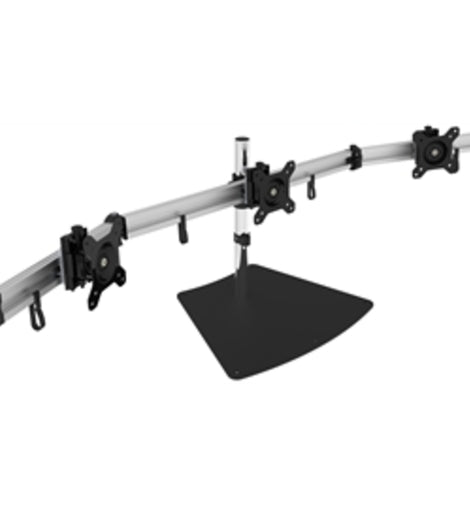 SIIG's Easy-Adjust Triple Monitor Desk Stand - 13" to 27" enables you to mount three monitors side-by-side to instantly create an ergonomic working environment. The premium quality aluminum mounting arms are built to last and easily support three monitors from 13" to 27" with weight up to 17.6 lbs each. Unique mounting bracket with detachable VESA plate is smartly designed to simplify the installation procedure and makes mounting the monitor to your desirable position quick and simple to manage. Durable hinges are integrated to allow the side monitors to be curved-in for maximum viewing comfort. Heavy duty counter-balanced base ensures stability and allows easy re-positioning around the desktop. This high quality easy-to-use triple monitor desk stand is an ideal workspace organizing tool to provide ergonomic comfort, free up desk space and increase productivity.