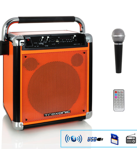 This Portable Party Speaker by Trexonic is the ultimate companion for all your audio needs. Lightweight and compact, this versatile speaker features a padded handle to effortlessly carry it everywhere with you. Whether as a PA system or to blast your favorite tunes, this speaker will be the perfect ally. Its vibrant orange color will put you in a joyful mood and make you the center of attention!