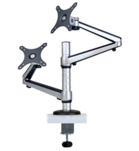 The VESA-compliant DDR1327DCS Dual Full Motion Flex Arm Desk Clamp attaches to your desk, table or workstation, allowing you to mount two monitors above it and free up valuable workspace. Ideal for home and office, the DDR1327DCS fits most flat-panel displays from 13 to 27 inches.