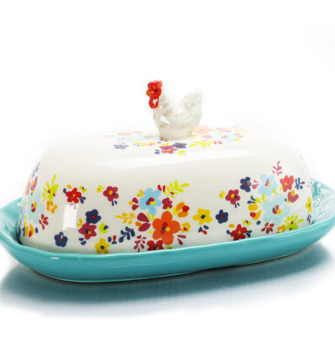 Gibson and rsquos Urban Market Life on the Farm 8.75 and rdquo Figural Rooster Butter Dish in Teal and Floral brings a pop of color to your morning breakfast table. Crafted from quality ceramic and finished with a glossy glaze, this floral farm butter dish is built for durability and to last for many meals to come. This dish is also dishwasher and microwave safe making it ideal for everyday use!