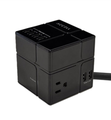The Accell Power Cube is a compact cube-shaped charging station offering total of 6 USB type A charging ports and 3 AC surge protected outlets to safeguard and charge all your daily electronics. It can also be separated into a standalone 4-USB travel wall charger and a power station with 2 USB-A and 3 AC charging outlets.