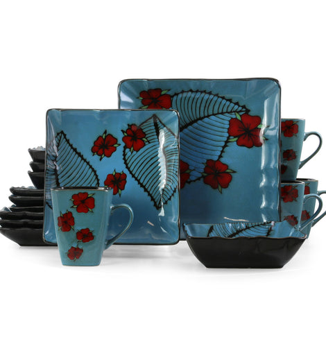 Add a beautiful accent to your dinner table with the Elama Aloha Tide 16 Piece Square Stoneware Dinnerware Set in Blue and Floral. Each dish is creatively crafted into unique and contemporary shapes and beautifully colored in stunning blue with red and black tropical accents. Each plate in this set is microwave safe for quick reheating and dishwasher safe for easy cleaning.