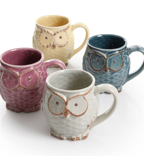 The Gibson Nocturnal Gaze 4 Piece 18oz. Stoneware Owl Mug Set in Assorted Colors adds elegance and fun to your favorite warm beverages! Each figural mug is crafted from stoneware and finished in a shiny glaze for a durable and long-lasting shine. This collection is both microwave and dishwasher safe, making each cup ideal for everyday use and easy cleaning. This set comes in four colors for a fun and diverse set: purple, yellow, blue, and green.