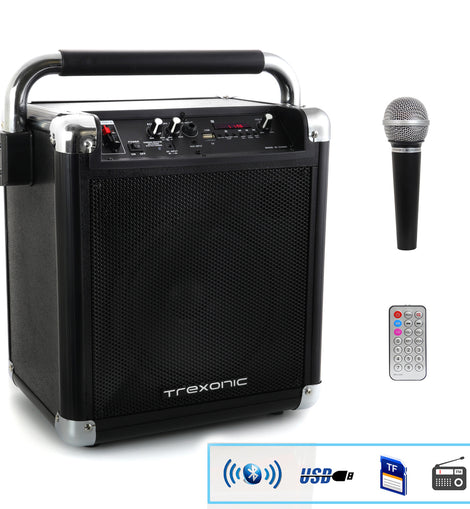 This Portable Party Speaker by Trexonic is the ultimate companion for all your audio needs. Lightweight and compact, this versatile speaker features a padded handle to effortlessly carry it everywhere with you. Whether as a PA system or to blast your favorite tunes, this speaker will be the perfect ally. Its timeless black finish will blend seamlessly with any setting.