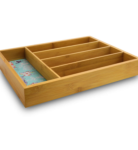 Gibson's Urban Market Life on the Farm 5 Compartment 14 and rdquo Bamboo Utensil Tray in Farm and Floral Pattern is the perfect "Farm to Table" accessory to add to your kitchen collection. This cutlery tray is crafted from quality eco-friendly bamboo and decorated with quaint floral and farm designs. The flatware holder is size-friendly and accommodates most kitchen drawers. Add this charming and handy holder to your home kitchen today!